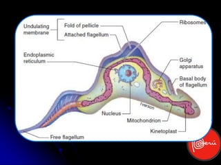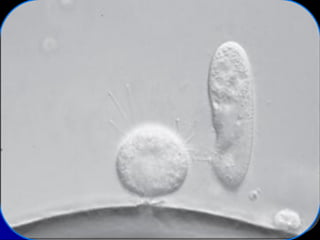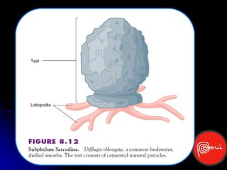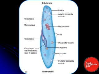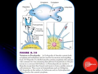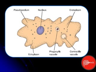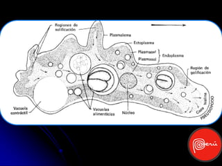 Este documento proporciona una descripción general de los protozoos. Explica que los protozoos son eucariotas unicelulares heterótrofos o autótrofos que incluyen grupos como los sarcode, ciliados, esporozoos y otros. Describe las características distintivas de cada filo principal de protozoos, incluidos los métodos de locomoción, alimentación, reproducción y más de 9,000 especies en total.