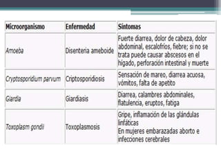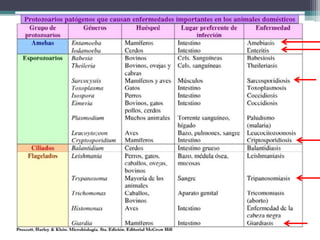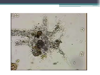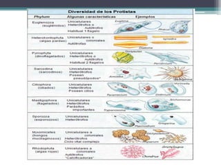 Este documento describe las características generales de los protozoarios. Son microorganismos eucarióticos unicelulares que carecen de paredes celulares y se presentan como células aisladas o en colonias. Poseen organelos como núcleo, vacuolas, cilios, flagelos o seudópodos adaptados para el movimiento, alimentación y reproducción. Existen varias clases de protozoarios clasificados según su morfología y organelos de movimiento, como los ciliados, flagelados, ameboideos y