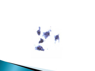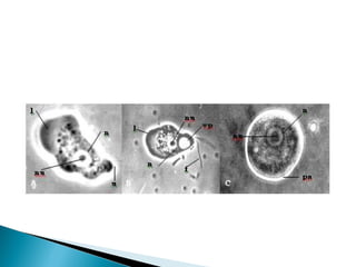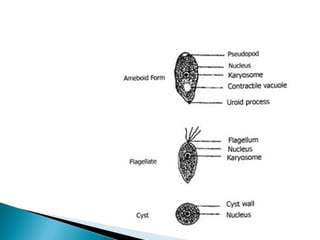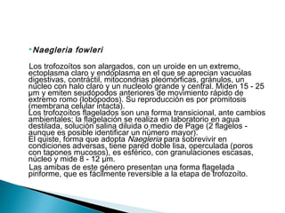 Este documento describe las características morfológicas de dos géneros de protozoos patógenos. Naegleria fowleri tiene trofozoítos alargados con un uroide en un extremo y pseudópodos lobópodos. Adopta una forma quística u operculada para sobrevivir en condiciones adversas. Acanthamoeba spp. tiene trofozoítos pleomórficos con pseudópodos finos llamados acantópodos y quistes esféricos con doble pared y poros.