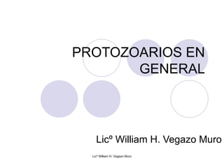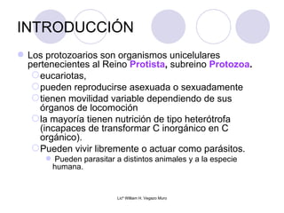 Este documento proporciona una introducción general a los protozoarios. Describe que son organismos unicelulares eucariotas que pueden reproducirse de forma asexual o sexual y que la mayoría son heterótrofos. Además, clasifica los principales protozoarios de interés médico según su localización en el huésped, distinguiendo entre los que habitan en el tracto gastrointestinal y los genital-urinarios, y los que viven en la sangre y tejidos.
