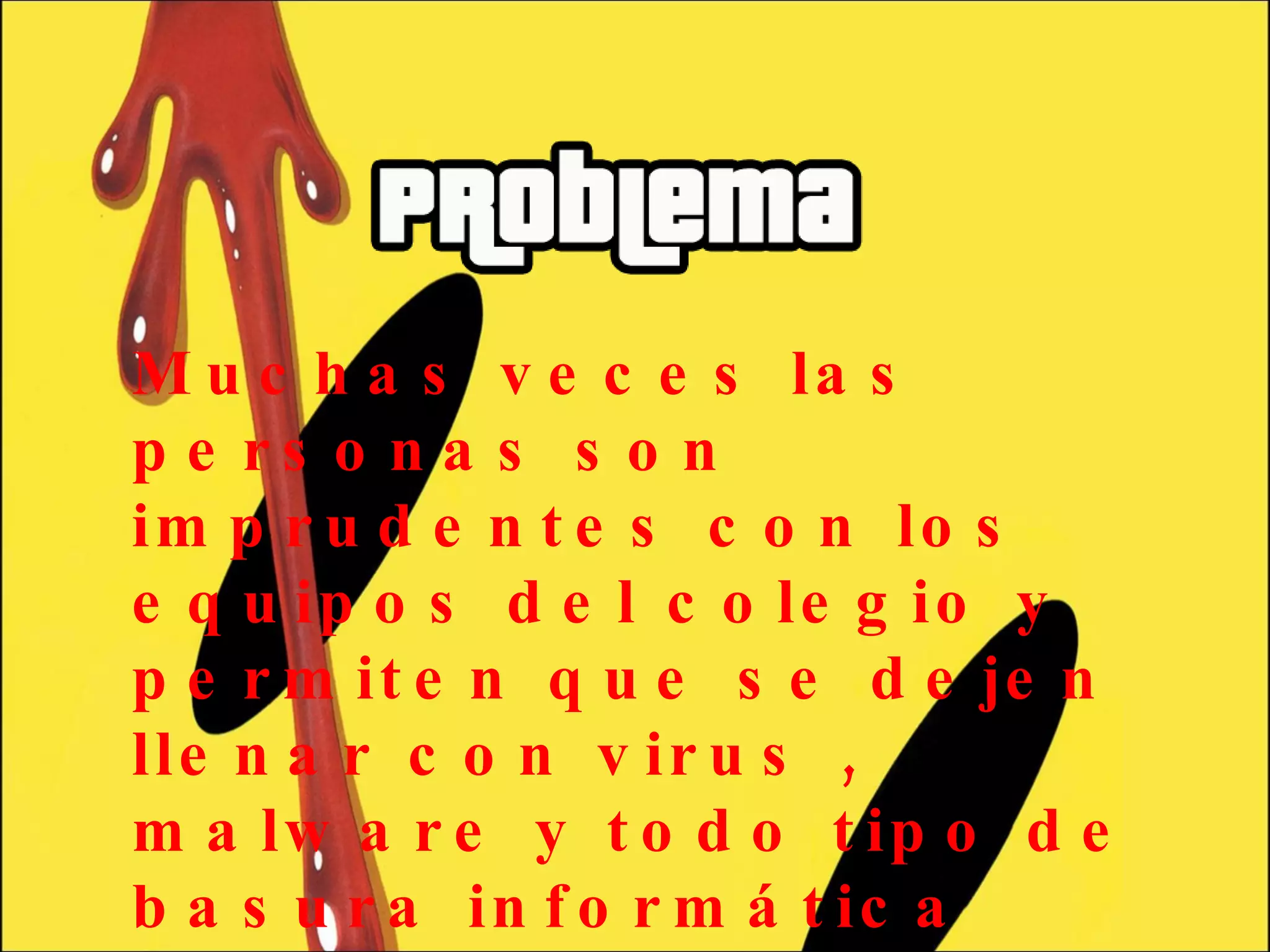 Los estudiantes a menudo son imprudentes con la tecnología de la escuela y permiten que los equipos se infecten con virus y malware, lo que causa fallas. El colegio usará software como Deep Freeze para congelar los discos duros, prevenir infecciones y restringir software innecesario, con el fin de mantener los sistemas funcionando para las clases.