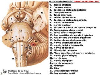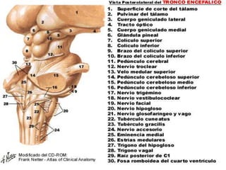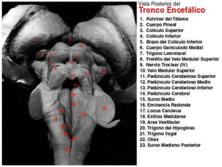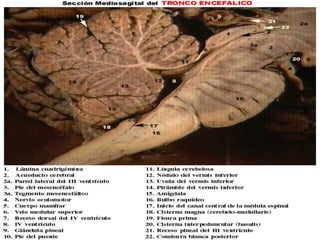 El puente o protuberancia es una porción del tronco encefálico que conecta el cerebelo y el bulbo raquídeo. Contiene varios nervios craneales y núcleos que controlan funciones motoras y sensoriales. Su estructura interna incluye núcleos pontinos, tractos ascendentes y descendentes, y el cuarto ventrículo.