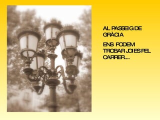 El documento describe los diferentes tipos de farolas que se encuentran en el Paseo de Gracia en Barcelona, incluyendo farolas modernas, antiguas, originales y elegantes en la pared.