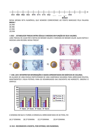 Este documento contiene una prueba de matemáticas para estudiantes de 4o grado. La prueba contiene 10 preguntas que evalúan diferentes habilidades matemáticas como leer números, realizar operaciones aritméticas, interpretar gráficos y resolver problemas. Algunas preguntas piden identificar números escritos en forma extensa, realizar sumas, restas, multiplicaciones y divisiones, leer horas en relojes, y analizar datos presentados en gráficos.
