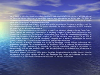La tecnología solar utiliza la energía del sol de dos formas: energía solar térmica para calentar agua y energía fotovoltaica para generar electricidad mediante módulos solares compuestos de celdas solares de silicio. Las celdas solares separan electrones y cargas positivas cuando son alcanzadas por la luz solar, creando una tensión eléctrica que puede ser recolectada. Aunque el efecto fotovoltaico fue descubierto en 1839, fue en 1953 cuando se crearon las primeras celdas solares modernas de sil