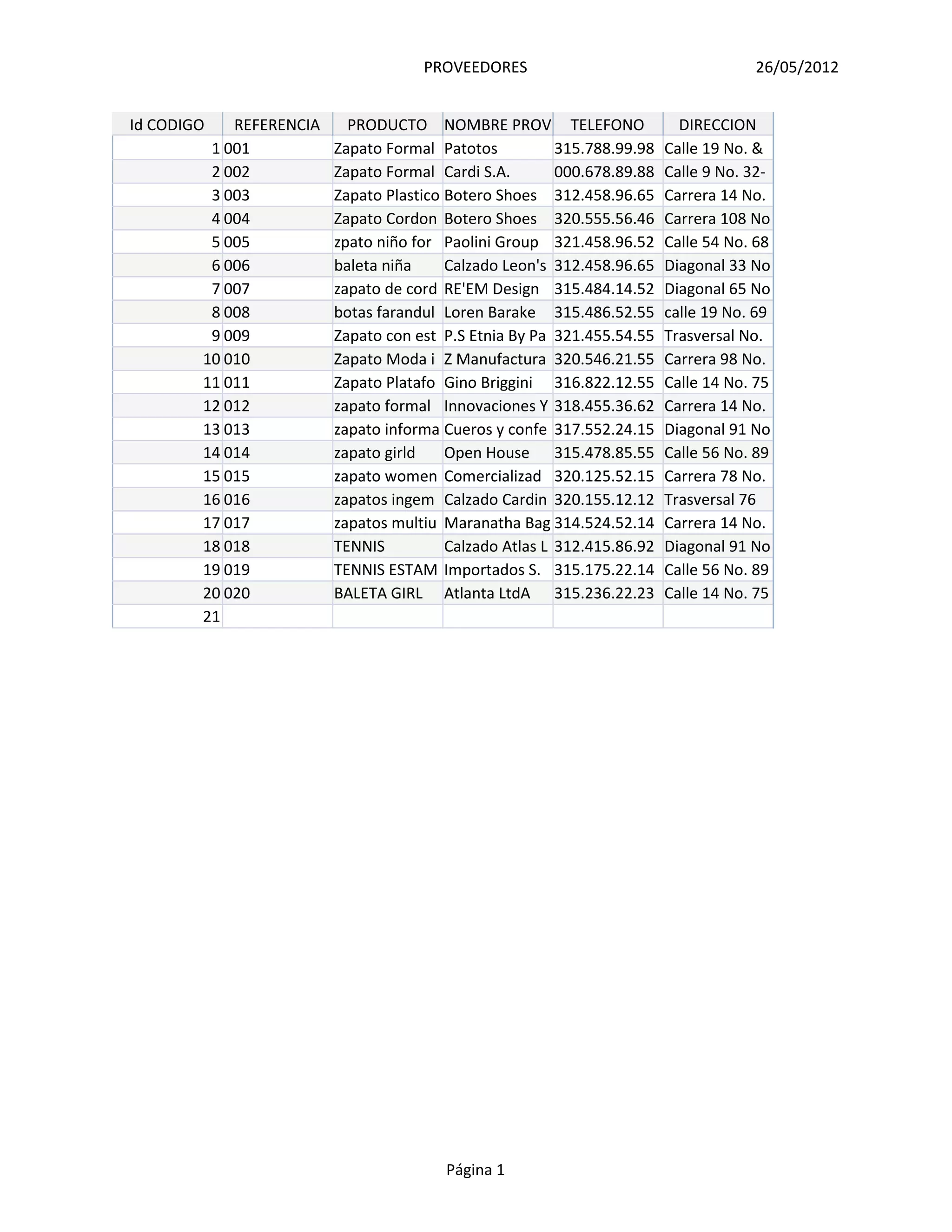 El documento proporciona una lista de 21 proveedores de zapatos y calzado, incluyendo su código, referencia del producto, nombre del producto, nombre del proveedor, número de teléfono, dirección y sucursal. La lista incluye detalles sobre proveedores de zapatos formales, zapatos de plástico, zapatos para niños, baletas, botas y tenis de diferentes países como Alemania, Chile, Brasil, China, México, Ecuador y España.