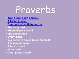Este documento contiene una serie de refranes en inglés y sus equivalentes en español. Algunos de los refranes tratan sobre no despreciar regalos, la importancia de los amigos en tiempos de necesidad, y hacer las cosas hoy en lugar de dejarlas para mañana. Otros enfatizan los beneficios de madrugar, que cuando hay voluntad se encuentra una solución, y que es mejor haber amado y perdido que nunca haber amado.