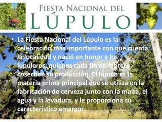La Fiesta Nacional del Lúpulo es la celebración más importante de la localidad de El Bolsón, Provincia de Río Negro. Comenzó en 1957 cuando un alemán trajo los primeros bulbos de lúpulo a la zona y los lugareños comenzaron a cultivarlo y comercializarlo, viendo su buen crecimiento en la región. La fiesta se realiza cada febrero en el predio del aeropuerto y cuenta con espectáculos, deportes, elección de la reina, feria regional y exposiciones para celebrar a los lupuler