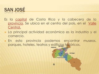 San José es la capital y centro económico de Costa Rica, conocida por sus museos, parques y edificios históricos. Alajuela alberga el principal aeropuerto y cultiva café, caña de azúcar y otros productos agrícolas. Cartago fue la antigua capital y es el hogar de la Basílica de los Ángeles y los volcanes Irazú y Turrialba.