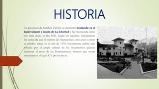La provincia de Sánchez Carrión se encuentra en el departamento de La Libertad en Perú. Fue reconocida como provincia en 1821 y originalmente se llamaba Huamachuco, cambiando su nombre a Sánchez Carrión en 1976. La provincia contiene 8 distritos y su capital es Huamachuco.