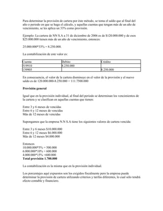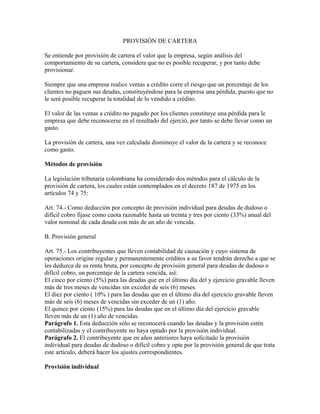 La provisión de cartera es el valor que una empresa estima no poder recuperar de las deudas de sus clientes. Existen dos métodos para calcular la provisión de cartera según la legislación colombiana: 1) la provisión individual, que aplica un 33% a deudas con más de un año de vencidas, y 2) la provisión general, que aplica porcentajes del 5%, 10% y 15% a deudas vencidas entre 3-6 meses, 6-12 meses y más de 12 meses respectivamente. La provisión de cartera se contabiliza como un