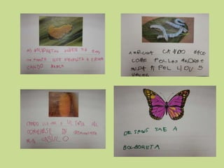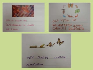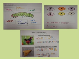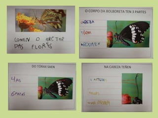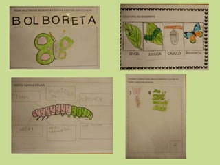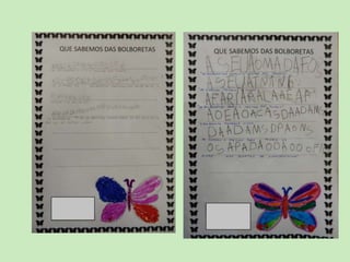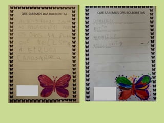 El proyecto 'As Bolboretas' del CEIP Quintela en Moaña, realizado por los alumnos de 6º de infantil durante el curso 2015-2016, se centró en la elección de una mariposa como mascota y en la investigación sobre su vida. Se llevaron a cabo actividades de decoración, recolección de información y experiencias prácticas, como el cuidado de orugas, fomentando diversas competencias educativas, desde la social hasta la matemática. Al final, se recopiló un libro con los aprendizajes y se realizó una exposición del trabajo en la biblioteca de la escuela.
