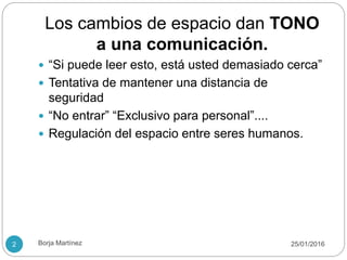 El documento aborda la importancia de la proxemia y la territorialidad en la comunicación humana, explicando cómo el uso del espacio personal afecta las interacciones. Se identifican diferentes conductas territoriales, métodos de defensa ante la invasión del espacio y los factores que influyen en las distancias interpersonales. Además, se analiza cómo la densidad poblacional y las características individuales afectan la percepción y regulación del espacio personal.