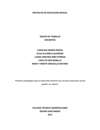 Este documento presenta un proyecto de educación sexual desarrollado por un grupo de docentes de un colegio técnico agropecuario en Colombia. El proyecto busca impartir una educación sexual integral y basada en valores a través de talleres y conferencias. Se justifica la necesidad del proyecto debido a que muchos estudiantes provienen de hogares disfuncionales y carecen de educación sexual adecuada. El proyecto sigue una estructura curricular que abarca diferentes dimensiones de la sexualidad humana a lo largo de las etapas de des