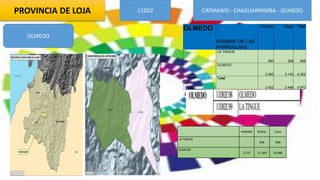 Este documento presenta datos demográficos de la provincia de Loja en Ecuador. Proporciona el número de hombres y mujeres en cada parroquia de 11 distritos diferentes (Calvas, Puyango, etc.), así como el total de la población urbana y rural. En total, se enumeran las estadísticas de más de 100 parroquias y la población total supera los 400,000 habitantes.
