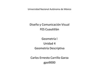 Esta unidad trata sobre geometría descriptiva. Forma parte de un curso de geometría en la Facultad de Estudios Superiores Cuautitlán de la Universidad Nacional Autónoma de México. El profesor a cargo es Carlos Ernesto Carrillo Garza y el grupo es el 9000.