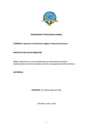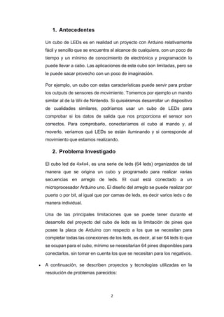 Este documento presenta un proyecto para crear un cubo de LEDs de 4x4x4 utilizando Arduino. El objetivo general es implementar animaciones en el cubo a través de códigos de programación en Arduino. Se explican conceptos como diodos LED, registros de desplazamiento y microcontroladores. La hipótesis es que mediante un manual y códigos de programación se podrán mostrar gráficas en el cubo LED. El proyecto aplica conocimientos de puertos de microcontroladores y programación en Arduino para visualizar las animaciones.