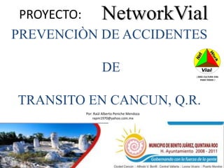 Este documento describe un proyecto llamado "Proyecto NetworkVial 2010" con el objetivo de promover una mayor cultura vial y prevención de accidentes en Cancún a través de una campaña publicitaria de 6 meses y la distribución de tarjetas con las 13 reglas básicas de seguridad vial para automovilistas, motociclistas y peatones. El proyecto busca reducir la siniestralidad en la ciudad en un 50% en los próximos 2-3 años mediante el fomento de una cultura de seguridad vial entre