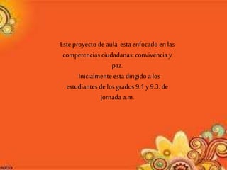 Este proyecto busca desarrollar habilidades asertivas en los estudiantes de los grados 9o de una institución educativa a través del uso de las TIC. El proyecto identificará conductas agresivas y realizará actividades como talleres y contenidos en redes sociales para fomentar la sana convivencia. El objetivo es que los estudiantes aprendan formas de comunicación no violentas que les permitan convivir en paz.