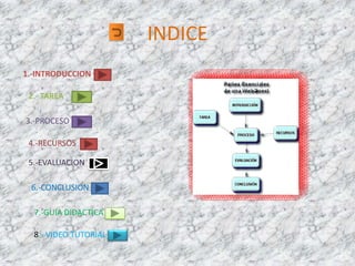 Este documento presenta una webquest diseñada por un equipo de estudiantes sobre el tema del agua. Incluye secciones para introducir el tema, describir la tarea, guiar el proceso de aprendizaje, proporcionar recursos, establecer la evaluación, invitar a la reflexión y ofrecer una guía didáctica para profesores. El objetivo es orientar a los estudiantes sobre el contenido y motivarlos a aprender de forma atractiva e interactiva completando la tarea final.