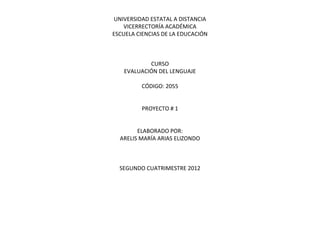 Este documento presenta un proyecto sobre la evaluación del lenguaje. Incluye una lista de palabras divididas por vocales, diptongos, consonantes y grupos consonánticos con su respectiva transcripción fonética. También contiene grupos semánticos de vocabulario organizados por categorías como animales, frutas, verduras, partes del cuerpo y ubicación espacial. Por último, presenta una bibliografía de medios electrónicos con imágenes que ilustran las palabras descritas.