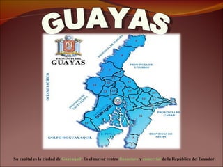 La provincia de Guayas se encuentra en la costa suroeste de Ecuador. Su capital y ciudad más grande es Guayaquil, un importante centro financiero y comercial. Algunas atracciones turísticas clave incluyen el Malecón 2000 a orillas del río Guayas, el Cerro Santa Ana que ofrece vistas panorámicas de la ciudad, y la rica gastronomía local que se centra en mariscos y frutas exóticas.