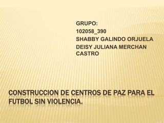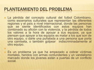 Este documento propone la construcción de centros de paz para el fútbol sin violencia en las principales ciudades de Colombia. El objetivo es crear espacios que promuevan la paz entre las barras de los diferentes equipos a través de talleres, charlas y actividades integradoras para los jóvenes. Se busca identificar a los hinchas y ofrecerles oportunidades productivas para alejarlos de la violencia relacionada con el fútbol.
