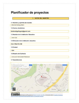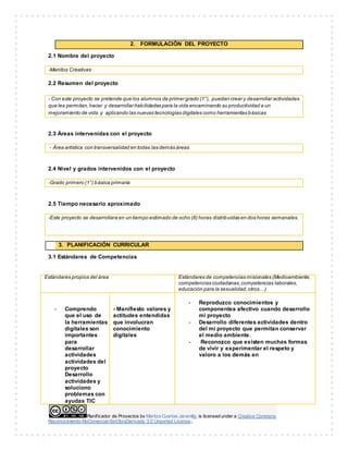 Este documento presenta la planificación de un proyecto educativo llamado "Manitos Creativas" dirigido a estudiantes de primer grado en la ciudad de Cali, Colombia. El proyecto busca desarrollar habilidades artísticas y de uso de tecnologías digitales en los estudiantes a través de actividades que se llevarán a cabo durante 8 horas distribuidas en 2 horas semanales. La planificación incluye detalles sobre los objetivos, contenidos, estrategias, recursos, evaluación y sistematización del proyecto.
