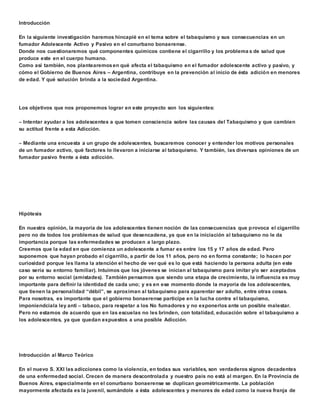 Este documento presenta un proyecto de investigación sobre el tabaquismo en adolescentes en el conurbano bonaerense de Argentina. El proyecto analizará los componentes químicos del cigarrillo y los problemas de salud que causa en fumadores activos y pasivos. También examinará cómo el gobierno de Buenos Aires aborda la prevención del tabaquismo en menores y las soluciones que brinda.