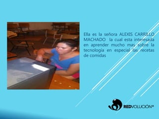 Este documento describe cómo Edwin Mendoza, un estudiante del programa Redvolución, enseñó a la señora Alexis Carrillo, una ama de casa y cocinera, a usar Internet para buscar recetas de cocina y tutoriales de costura. La señora Alexis aprendió a encender y apagar la computadora, usar Google para buscar sitios web de recetas, y cómo buscar sus recetas favoritas y videos tutoriales de modistería. Al final, la señora Alexis agradeció a Edwin y al programa Redvolución por enseñarle