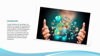 Este documento discute la tecnología y su impacto en la sociedad. Define la tecnología como el conjunto de conocimientos técnicos que facilitan la adaptación al medio ambiente y satisfacen las necesidades humanas. Ofrece ejemplos de cómo la tecnología ha cambiado a través de nuevos productos e innovaciones, y cómo ciertas tecnologías como la fibra óptica y los automóviles eléctricos observan aspectos de la realidad. Finalmente, señala que la tecnología ha marcado tendencias globales y afect