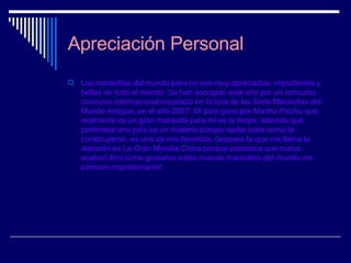 Este documento presenta las 7 nuevas maravillas del mundo elegidas en 2007. Incluye breves descripciones de cada maravilla: Machu Picchu en Perú, el Templo de Kukulcán en México, el Cristo Redentor en Brasil, la ciudad de Petra en Jordania, el Taj Mahal en India, la Gran Muralla China y el Coliseo de Roma.