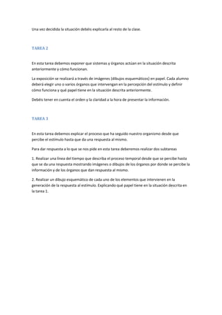 Este proyecto consiste en tres tareas relacionadas con el estudio de los sistemas y órganos involucrados en la percepción de estímulos y la respuesta a los mismos. Los estudiantes se dividirán en grupos para seleccionar una situación cotidiana que involucre un estímulo y respuesta. Luego, describirán los sistemas y órganos implicados a través de imágenes y explicarán el proceso completo desde la percepción del estímulo hasta la respuesta mediante una línea de tiempo y dibuj