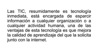 Este documento resume las Tecnologías de la Información y la Comunicación (TIC) y sus aplicaciones. Explica que las TIC mejoran la calidad del aprendizaje y la comunicación a través de Internet. Describe dos aplicaciones principales: el comercio electrónico (e-commerce), que permite compras en línea, y la banca electrónica (e-banking), que facilita las transacciones financieras desde casa de forma rápida y segura. Finalmente, concluye que las TIC ayudan en la vida diaria y el aprendizaje,
