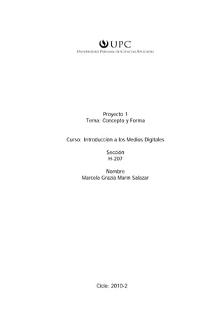 Este documento presenta un proyecto sobre el desarrollo de un concepto y su representación gráfica. Los objetivos son crear un concepto, diseñar una forma visual que genere la asociación conceptual, y usar Illustrator para la producción. Se propone el concepto "el joven era Gay" y se describen dos viñetas que muestran inicialmente a tres chicas mirando a un joven y luego al mismo joven de la mano con otro, para que los espectadores asocien las imágenes y capturen el concepto de que el joven era gay.
