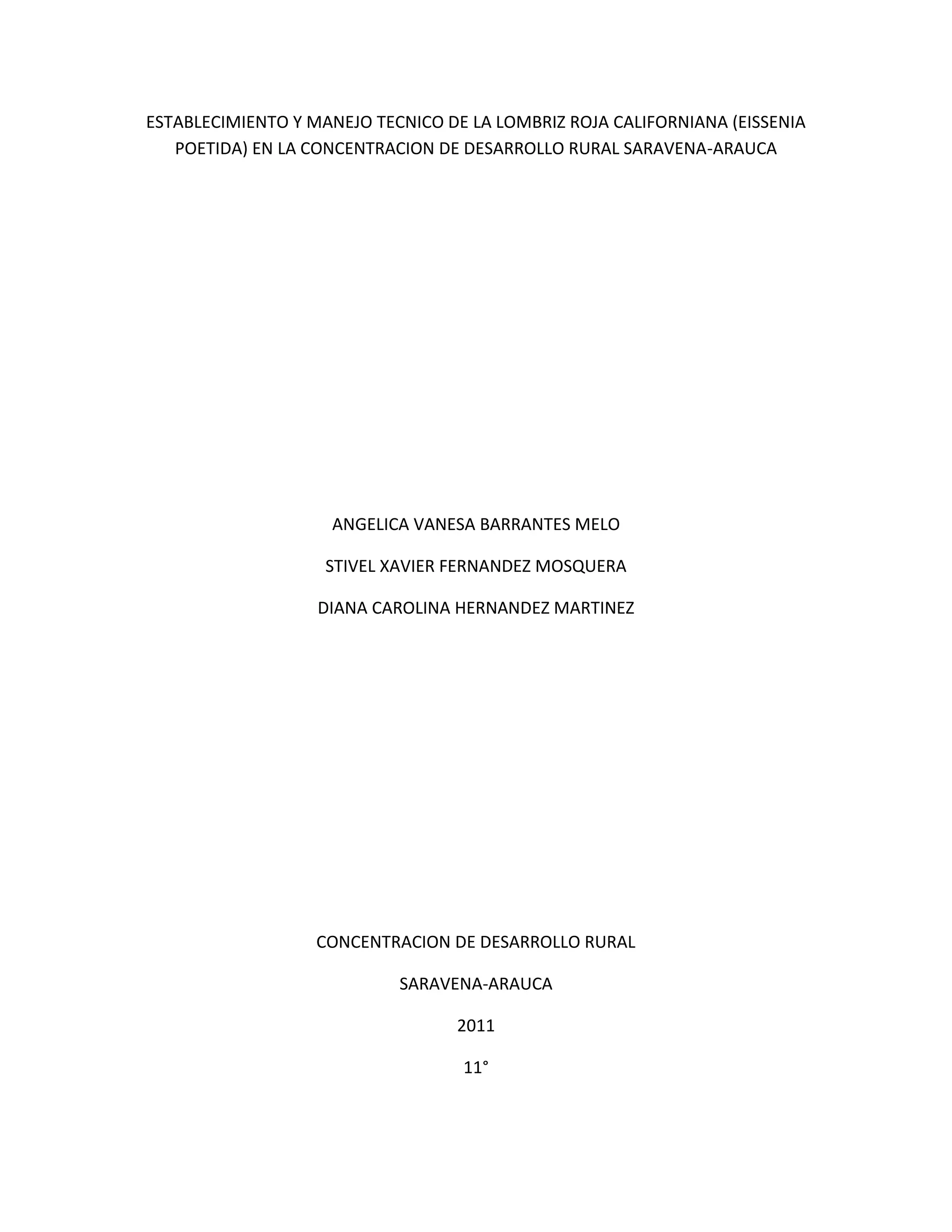 Este documento describe el establecimiento y manejo técnico de la lombriz roja californiana (Eissenia poetida) en la Concentración de Desarrollo Rural Saravena-Arauca. El proyecto busca enseñar a la comunidad sobre el manejo de la lombricultura para mejorar la agricultura y la economía local mediante la producción de humus líquido y sólido. Se detallan los objetivos, la metodología y los antecedentes del proyecto, así como información técnica sobre la lombriz roja californiana