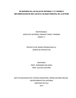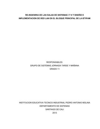 Este documento presenta un proyecto para re-diseñar las salas de sistemas I y II y diseñar e implementar una red LAN en el bloque principal de la Institución Educativa Técnico Industrial Pedro Antonio Molina. El proyecto será realizado por estudiantes de grado 11 de la especialidad en sistemas e informática y tiene como objetivo mejorar la comunicación y compartir recursos entre los salones de la institución de manera más rápida y eficiente. El documento describe el contexto, objetivos, métodos, recursos y cronograma del pro