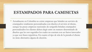 El documento propone el lanzamiento de una empresa llamada BEYOND que ofrecerá estampados personalizados de alta calidad para camisetas, permitiendo que los clientes elijan el diseño y el tipo de tela. BEYOND realizará un estudio de mercado para comprender las necesidades insatisfechas de los consumidores y ofrecer una solución innovadora. La visión es posicionarse como una opción líder en el mercado, manteniendo valores como la satisfacción del cliente.