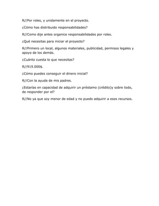 El documento describe un proyecto que recicla basura plástica recolectada para construir casas para personas necesitadas. El proyecto será llevado a cabo por un individuo y su equipo de trabajo, y requiere $400,000 en costos iniciales, con ingresos proyectados de $200,000 mensuales. Se necesitan $919,000 para iniciar el proyecto, que el individuo planea obtener con la ayuda de sus padres.