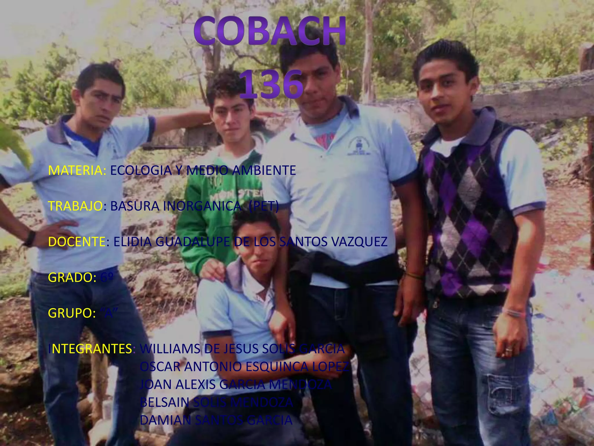 El documento habla sobre un proyecto escolar de 6to grado sobre basura inorgánica (PET). El proyecto busca educar a los estudiantes sobre el reciclaje de PET mediante las tres erres - reducir, reutilizar y reciclar. También colocaron recipientes en la escuela para separar y depositar el PET de otros desechos.