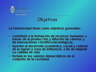Este documento presenta los objetivos y fundamentación de un proyecto institucional para una universidad. Los objetivos generales son contribuir a la formación de recursos humanos a través de la producción y difusión de saberes, apoyar el desarrollo económico, social y cultural de la región, y fortalecer los valores democráticos. El proyecto se basa en los planes de desarrollo nacional y provincial, así como en el análisis de la demanda y oferta académica. Se propone organizar la oferta académica en