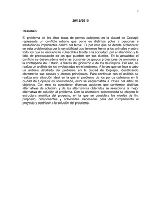 El documento presenta un informe final sobre un proyecto para disminuir la tasa de perros callejeros en la ciudad de Copiapó. Se analizan los involucrados en el problema, incluyendo a los dueños de perros, grupos protectores de animales y el Estado. Se describe la situación problemática de las altas tasas de perros callejeros y sus causas. Se propone un objetivo ideal de solucionar el problema y se consideran diversas alternativas de solución. Finalmente, se selecciona la mejor alternativa y se elabora una estructura anal