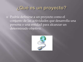 Este documento define qué es un proyecto y describe diferentes tipos de proyectos como proyectos sociales, de investigación e inversión. Explica que un proyecto es un conjunto de actividades para alcanzar un objetivo dentro de un presupuesto y plazo definidos. También describe las diferentes etapas en el desarrollo de un proyecto como la idea, identificación, perfil, factibilidad, ejecución y operación.