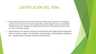 Este proyecto se centra en explorar los sentidos a través de actividades manipulativas y sensoriales durante 4 semanas. Los objetivos son que los niños descubran su cuerpo y aprendan jugando. Se trabajarán los cinco sentidos con actividades como explorar texturas, reconocer sonidos y olores, y probar alimentos. La metodología será activa y cooperativa, partiendo de las ideas previas de los niños.