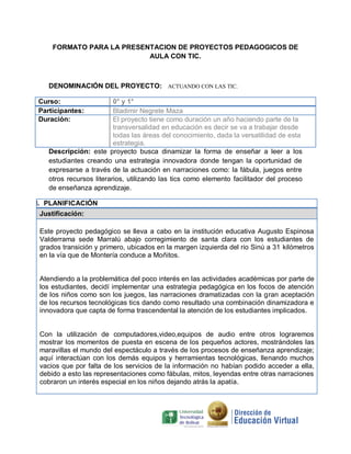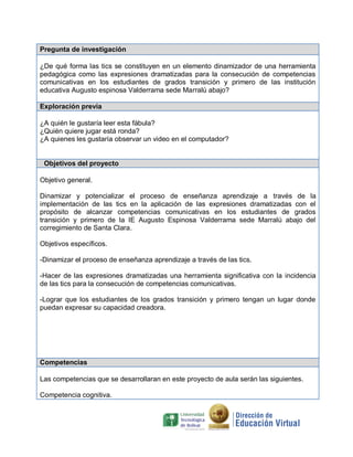 Este proyecto busca dinamizar la enseñanza de la lectura en estudiantes de 0° y 1° a través de la actuación y el uso de las TIC. Los estudiantes aprenderán dramatizando fábulas, juegos y otras narrativas con computadores, video y audio. El proyecto durará un año y cubrirá diferentes áreas del conocimiento. Se espera que captando la atención de los estudiantes con las TIC, disminuya su apatía hacia las actividades académicas.