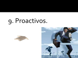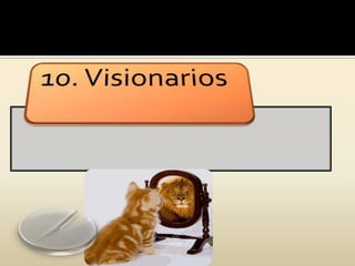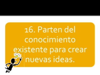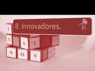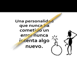 Este documento enumera 20 características de las personas creativas, incluyendo ser curiosos, independientes, persistentes, pensar de forma metafórica, tomar decisiones, ser no convencionales, inventivos y comprometidos. Concluye que las personas que se atreven a cambiar y vencer sus miedos valen más por su disposición a tomar riesgos.