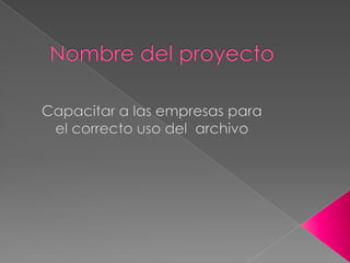 Este documento presenta una propuesta para capacitar a empresas en el uso adecuado de archivos a través de asesorías y capacitaciones sobre la recepción y despacho de documentos. La empresa busca fomentar el uso correcto de procesos archivísticos en entidades públicas y privadas para mejorar la eficiencia y reducir costos. El plan incluye una misión, visión, objetivos y justificación, así como un presupuesto inicial de $95 millones para dar inicio al proyecto.