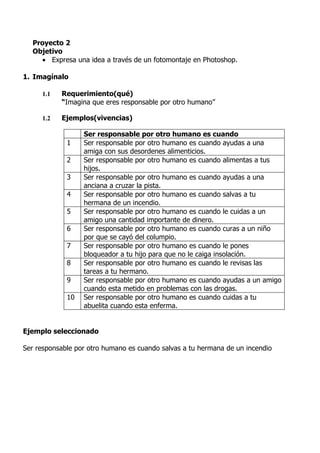 Este documento describe un proyecto de Photoshop para un curso de Introducción a los Medios Digitales. El objetivo del proyecto es expresar una idea a través de un fotomontaje en Photoshop sobre el tema de ser responsable por otro ser humano. Se proporcionan ejemplos y se selecciona uno para desarrollar con palabras y un boceto, y luego producir el fotomontaje final en Photoshop usando al menos 5 fotos.