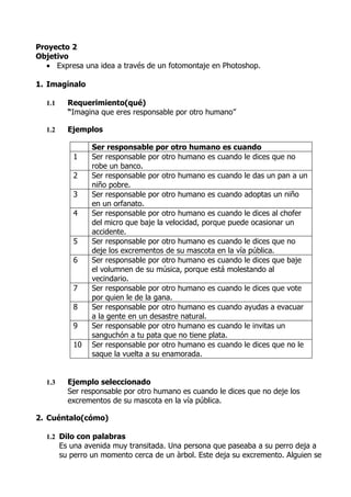 Este documento presenta un proyecto de Photoshop sobre ser responsable por otro ser humano. El objetivo es expresar esta idea a través de un fotomontaje. Se proporcionan ejemplos de cómo ser responsable por otro, seleccionándose "decirle a alguien que no deje los excrementos de su mascota en la vía pública". Luego, se pide describir esta situación con palabras y un boceto. Finalmente, se instruye crear un fotomontaje en Photoshop usando al menos 5 fotos que cumplan con los requ