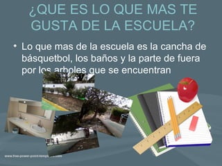 El estudiante disfruta de la cancha de baloncesto, los baños y los árboles alrededor de la escuela. No le gustan las escaleras porque hay muchas. Su materia favorita es química porque enseña sobre los elementos químicos, y su menos favorita es matemáticas debido a las dificultades con los números.